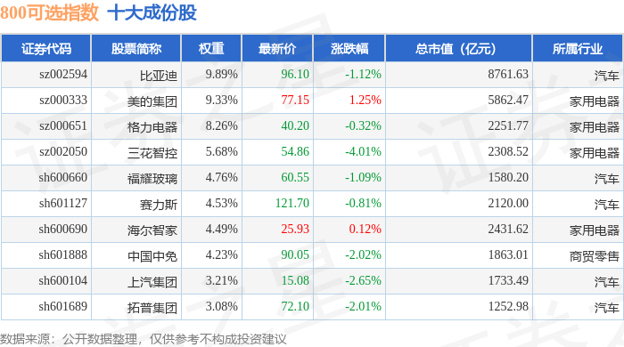 800可选(000931)指数十大成份股详情如下: