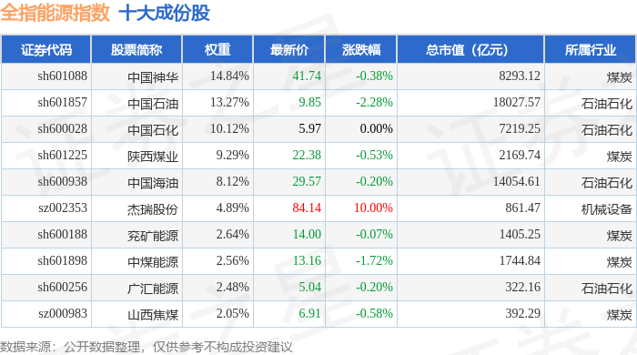 全指能源(000986)指数十大成份股详情如下:
