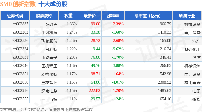 SME创新(399017)指数十大成份股详情如下: