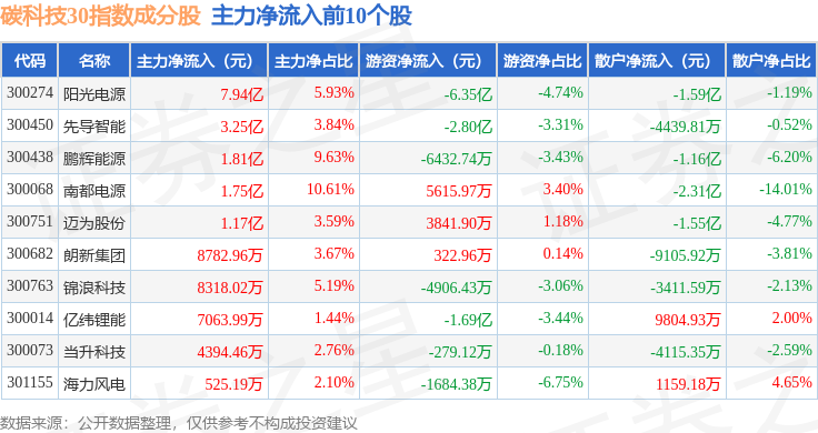 资金流向方面,碳科技30(399030)指数成份股当日主力资金净流出合计12.26亿元,游资资金净流出合计4.71亿元,散户资金净流入合计16.97亿元。成份股资金流向详情见下表: