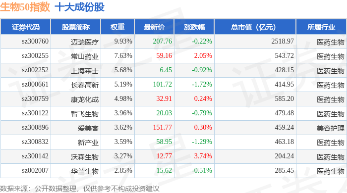 生物50(399280)指数十大成份股详情如下: