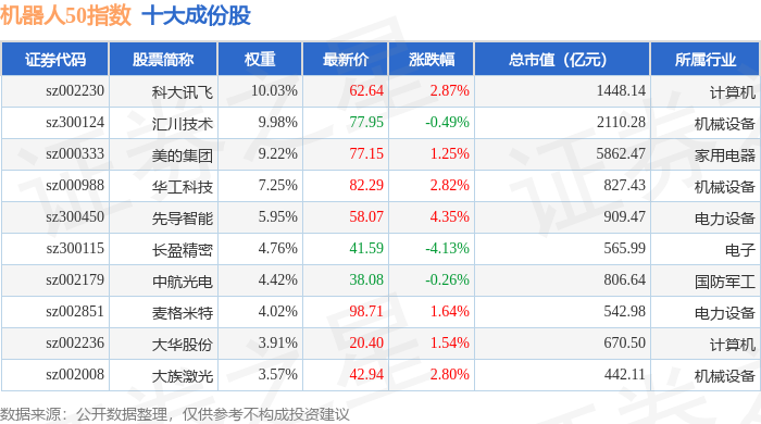 资金流向方面,机器人50(399283)指数成份股当日主力资金净流出合计26.91亿元,游资资金净流出合计5.27亿元,散户资金净流入合计32.18亿元。成份股资金流向详情见下表: