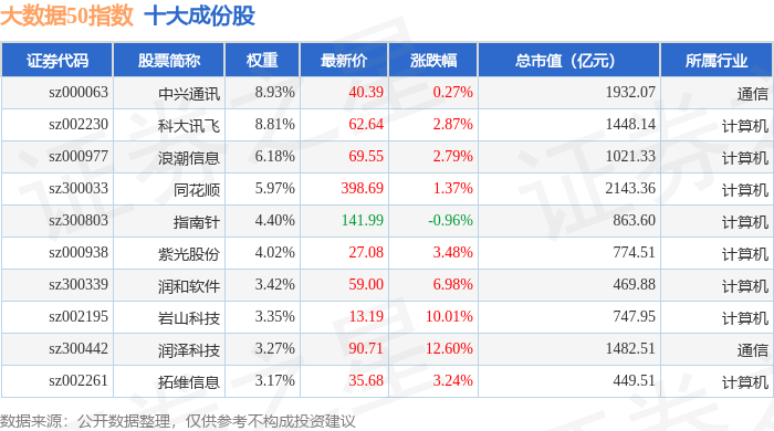 大数据50(399282)指数十大成份股详情如下: