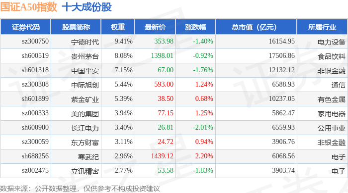 资金流向方面,国证A50(399310)指数成份股当日主力资金净流出合计89.67亿元,游资资金净流入合计21.13亿元,散户资金净流入合计68.54亿元。成份股资金流向详情见下表: