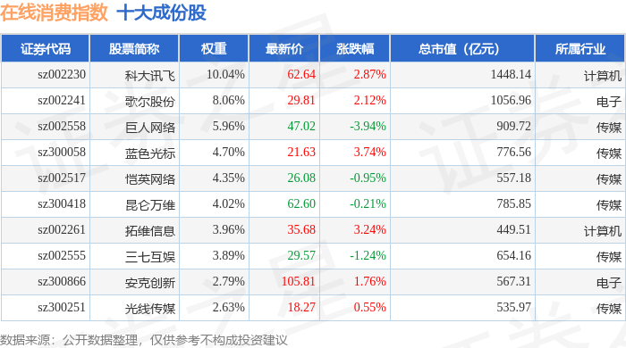 在线消费(399361)指数十大成份股详情如下: