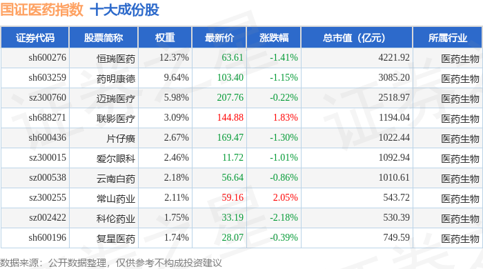国证医药(399394)指数十大成份股详情如下: