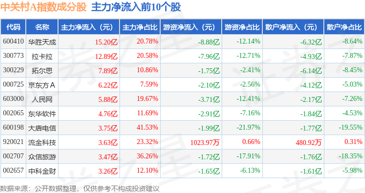 资金流向方面,中关村A(399422)指数成份股当日主力资金净流出合计44.67亿元,游资资金净流出合计18.6亿元,散户资金净流入合计67.0亿元。成份股资金流向详情见下表: