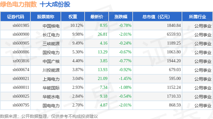 资金流向方面,绿色电力(399438)指数成份股当日主力资金净流出合计20.49亿元,游资资金净流入合计9.24亿元,散户资金净流入合计11.25亿元。成份股资金流向详情见下表: