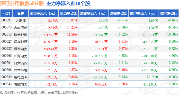 资金流向方面,深证公用(399622)指数成份股当日主力资金净流入合计6.45亿元,游资资金净流出合计2.63亿元,散户资金净流出合计3.82亿元。成份股资金流向详情见下表: