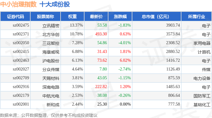 中小治理(399650)指数十大成份股详情如下: