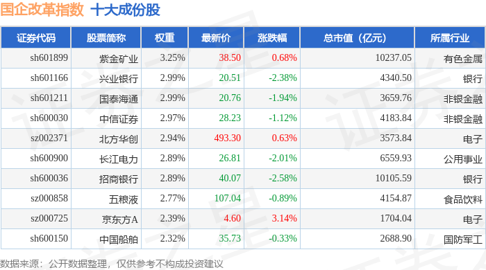 国企改革(399974)指数十大成份股详情如下: