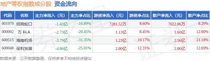 资金流向方面,地产等权(399983)指数成份股当日主力资金净流出合计12.02亿元,游资资金净流入合计5.09亿元,散户资金净流入合计6.93亿元。成份股资金流向详情见下表: