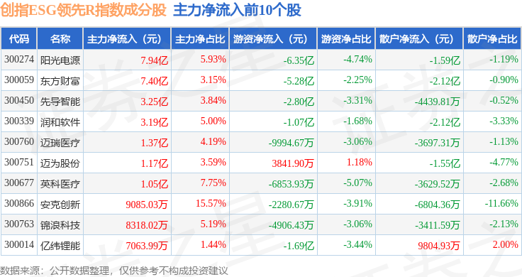 资金流向方面,创指ESG领先R(470031)指数成份股当日主力资金净流出合计16.61亿元,游资资金净流出合计10.39亿元,散户资金净流入合计26.99亿元。成份股资金流向详情见下表: