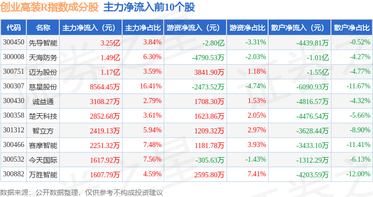 资金流向方面,创业高装R(470040)指数成份股当日主力资金净流出合计28.21亿元,游资资金净流入合计5.08亿元,散户资金净流入合计23.13亿元。成份股资金流向详情见下表: