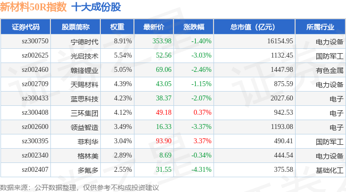 新材料50R(470042)指数十大成份股详情如下: