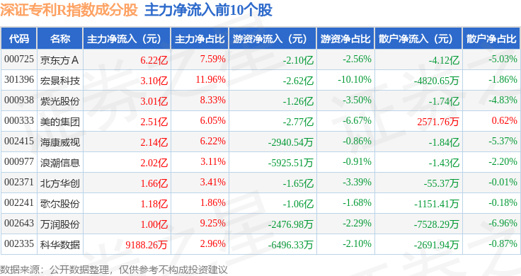 资金流向方面,深证专利R(470067)指数成份股当日主力资金净流出合计72.41亿元,游资资金净流入合计10.38亿元,散户资金净流入合计62.03亿元。成份股资金流向详情见下表: