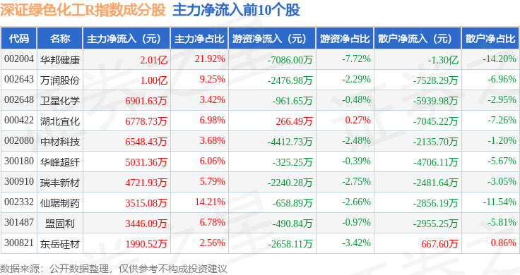 资金流向方面,深证绿色化工R(470076)指数成份股当日主力资金净流出合计33.79亿元,游资资金净流入合计4.63亿元,散户资金净流入合计29.16亿元。成份股资金流向详情见下表: