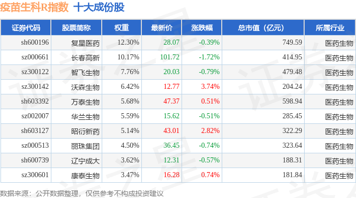 疫苗生科R(480015)指数十大成份股详情如下: