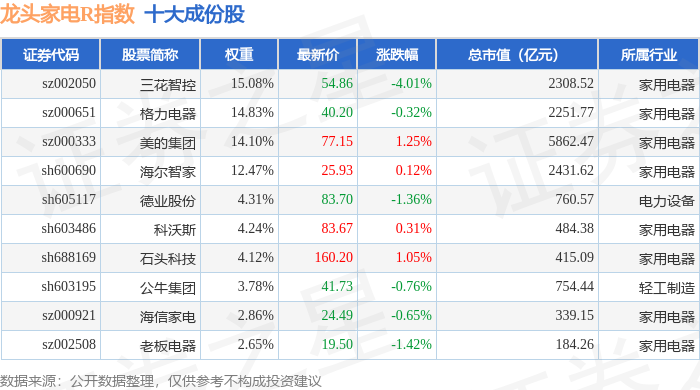 证券之星消息,1月14日,龙头家电R(480028)指数报收于20505.93点,跌0.34%,成交322.28亿元,换手率2.02%。当日该指数成份股中,上涨的有13家,禾盛新材以10.0%的涨幅领涨,下跌的有14家,三花智控以4.01%的跌幅领跌。