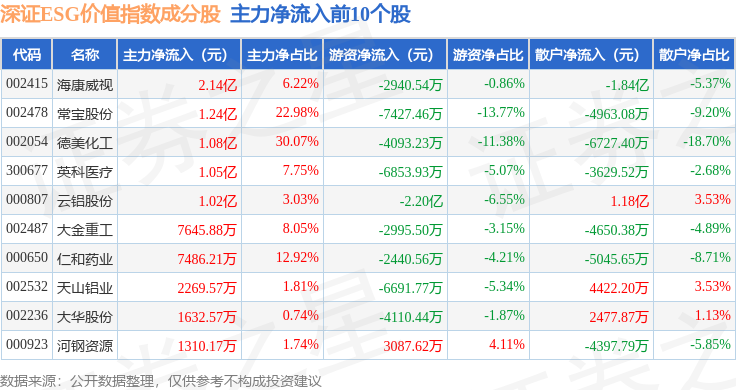 资金流向方面,深证ESG价值(970061)指数成份股当日主力资金净流出合计46.89亿元,游资资金净流入合计4.61亿元,散户资金净流入合计42.28亿元。成份股资金流向详情见下表: