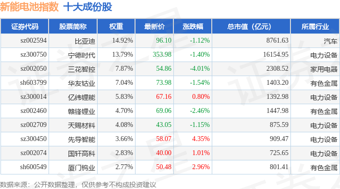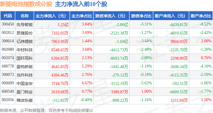 资金流向方面,新能电池(980032)指数成份股当日主力资金净流出合计67.51亿元,游资资金净流入合计11.12亿元,散户资金净流入合计55.96亿元。成份股资金流向详情见下表: