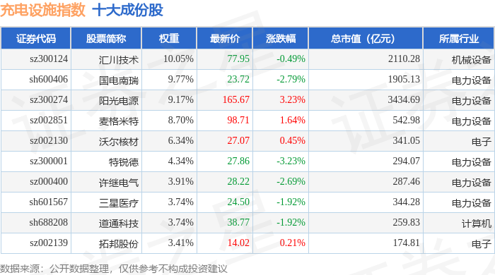 充电设施(980077)指数十大成份股详情如下: