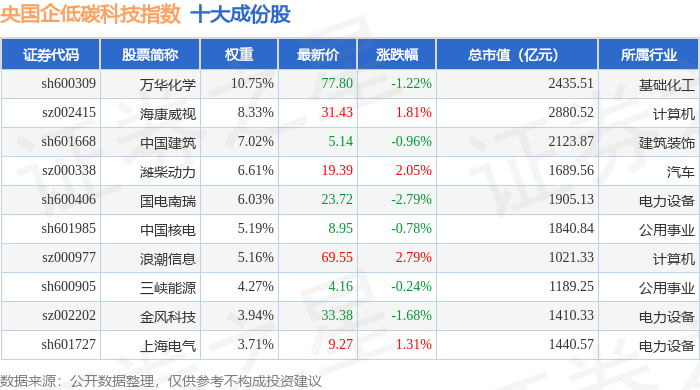 央国企低碳科技(980082)指数十大成份股详情如下: