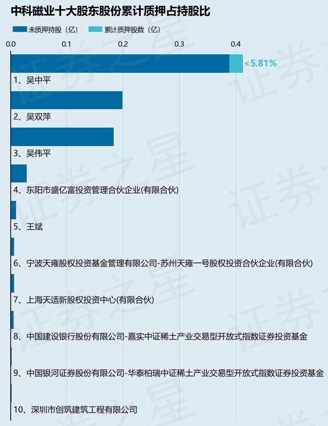 截止本公告日,股东吴中平已累计质押股份240.0万股,占其持股总数的5.81%。本次质押后中科磁业十大股东的累计质押股份占持股比例(占持股比例的计算以公司最新一期财务报表公布的十大股东的持股总数为基准)见下图:
