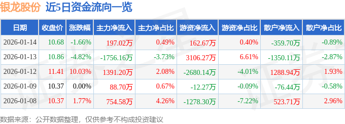 证券之星消息,截至2026年1月14日收盘,银龙股份(603969)报收于10.68元,下跌1.66%,换手率4.47%,成交量37.7万手,成交额4.03亿元。