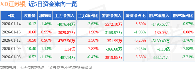 证券之星消息,截至2026年1月14日收盘,XD江苏银(600919)报收于10.12元,下跌1.46%,换手率0.83%,成交量151.71万手,成交额15.49亿元。