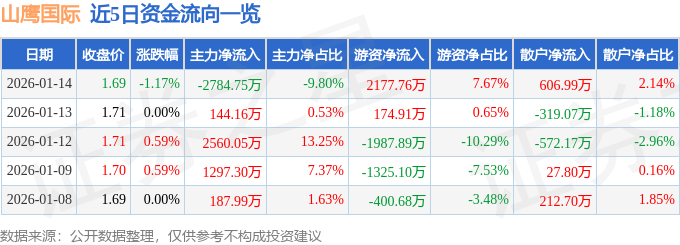 证券之星消息,截至2026年1月14日收盘,山鹰国际(600567)报收于1.69元,下跌1.17%,换手率2.65%,成交量167.0万手,成交额2.84亿元。