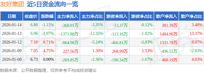 证券之星消息,截至2026年1月14日收盘,友好集团(600778)报收于6.88元,下跌1.15%,换手率5.1%,成交量15.87万手,成交额1.1亿元。