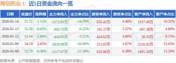 证券之星消息,截至2026年1月14日收盘,海创药业(688302)报收于51.72元,下跌1.11%,换手率2.84%,成交量2.82万手,成交额1.47亿元。