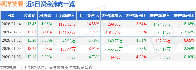 证券之星消息,截至2026年1月14日收盘,镇洋发展(603213)报收于13.47元,下跌1.03%,换手率1.38%,成交量6.08万手,成交额8220.82万元。