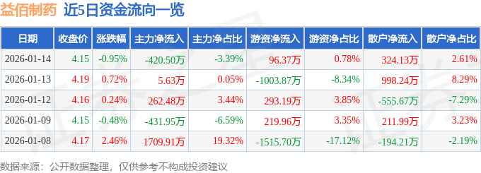 证券之星消息,截至2026年1月14日收盘,益佰制药(600594)报收于4.15元,下跌0.95%,换手率3.76%,成交量29.78万手,成交额1.24亿元。