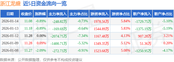 1月14日的资金流向数据方面,主力资金净流出248.82万元,占总成交额0.73%,游资资金净流入1978.56万元,占总成交额5.84%,散户资金净流出1729.75万元,占总成交额5.1%。