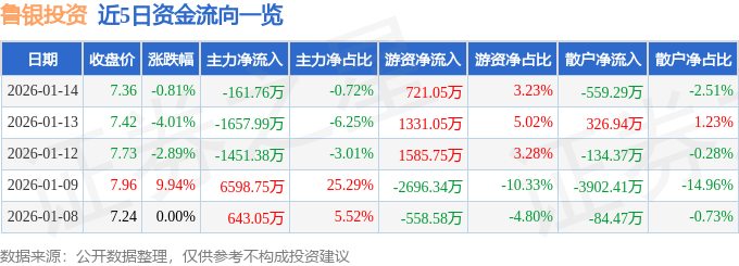 证券之星消息,截至2026年1月14日收盘,鲁银投资(600784)报收于7.36元,下跌0.81%,换手率4.49%,成交量30.35万手,成交额2.23亿元。