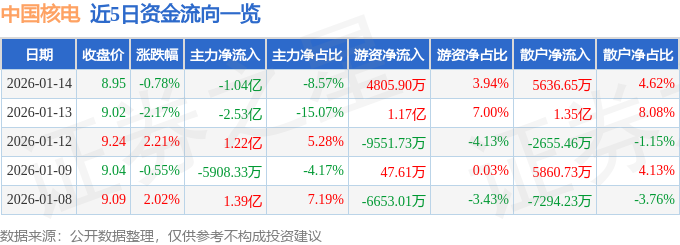 证券之星消息,截至2026年1月14日收盘,中国核电(601985)报收于8.95元,下跌0.78%,换手率0.72%,成交量135.49万手,成交额12.19亿元。