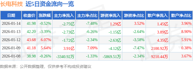 证券之星消息,截至2026年1月14日收盘,长电科技(600584)报收于41.98元,下跌0.52%,换手率4.84%,成交量86.56万手,成交额36.69亿元。