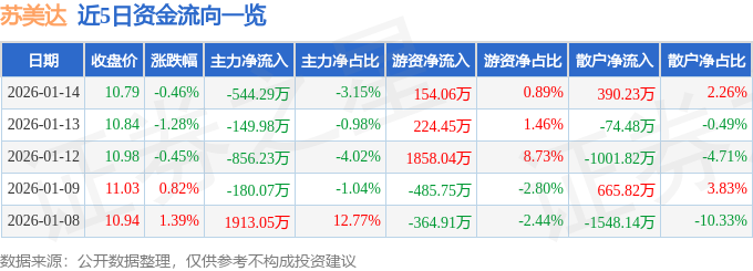 1月14日的资金流向数据方面,主力资金净流出544.29万元,占总成交额3.15%,游资资金净流入154.06万元,占总成交额0.89%,散户资金净流入390.23万元,占总成交额2.26%。