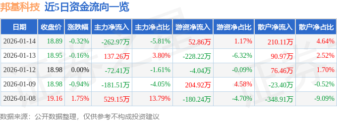 证券之星消息,截至2026年1月14日收盘,邦基科技(603151)报收于18.89元,下跌0.32%,换手率1.4%,成交量2.39万手,成交额4527.06万元。