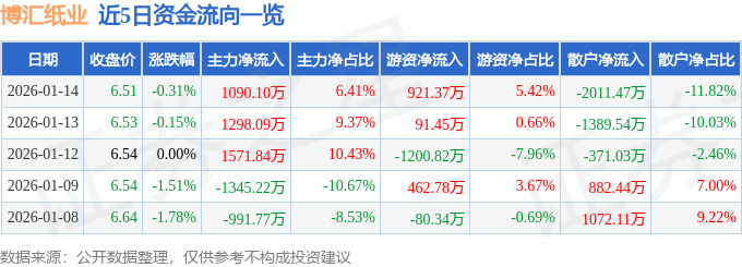 证券之星消息,截至2026年1月14日收盘,博汇纸业(600966)报收于6.51元,下跌0.31%,换手率1.96%,成交量26.18万手,成交额1.7亿元。