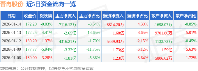 1月14日的资金流向数据方面,主力资金净流出7116.12万元,占总成交额3.54%,游资资金净流入8814.2万元,占总成交额4.39%,散户资金净流出1698.07万元,占总成交额0.85%。