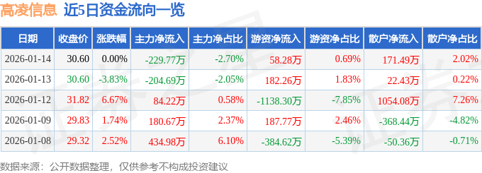 证券之星消息,截至2026年1月14日收盘,高凌信息(688175)报收于30.6元,上涨0.0%,换手率2.15%,成交量2.78万手,成交额8502.01万元。