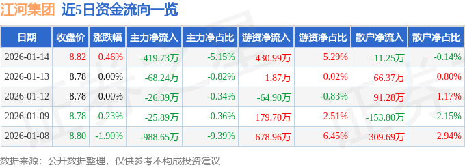 证券之星消息,截至2026年1月14日收盘,江河集团(601886)报收于8.82元,上涨0.46%,换手率0.82%,成交量9.25万手,成交额8142.41万元。