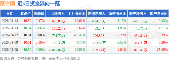 证券之星消息,截至2026年1月14日收盘,聚合顺(605166)报收于10.59元,上涨0.47%,换手率1.65%,成交量5.18万手,成交额5504.06万元。