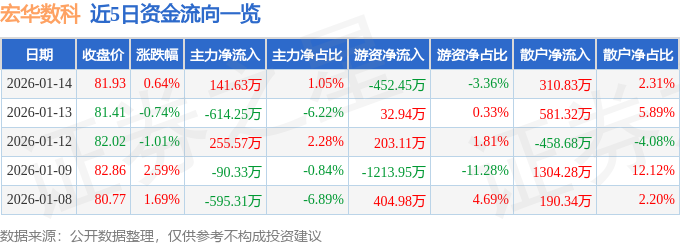 证券之星消息,截至2026年1月14日收盘,宏华数科(688789)报收于81.93元,上涨0.64%,换手率0.91%,成交量1.65万手,成交额1.35亿元。