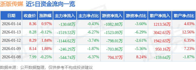 证券之星消息,截至2026年1月14日收盘,浙版传媒(601921)报收于8.36元,上涨0.97%,换手率1.61%,成交量35.87万手,成交额3.01亿元。