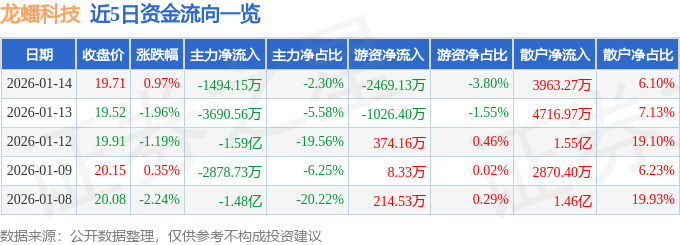1月14日的资金流向数据方面,主力资金净流出1494.15万元,占总成交额2.3%,游资资金净流出2469.13万元,占总成交额3.8%,散户资金净流入3963.27万元,占总成交额6.1%。