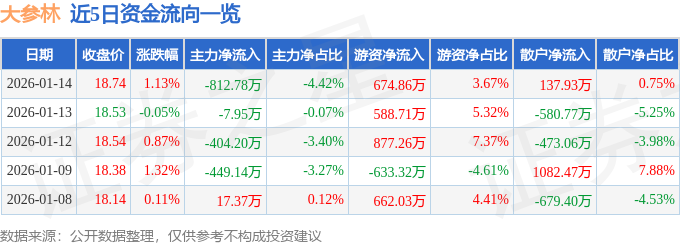 1月14日的资金流向数据方面,主力资金净流出812.78万元,占总成交额4.42%,游资资金净流入674.86万元,占总成交额3.67%,散户资金净流入137.93万元,占总成交额0.75%。